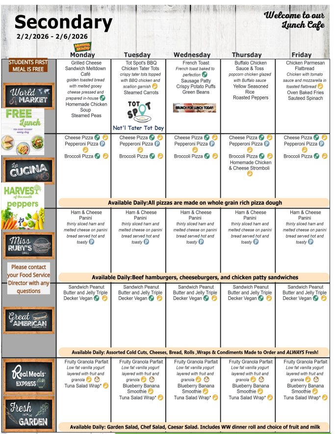 Menus for the elementary and secondary schools are listed below and are also available online.