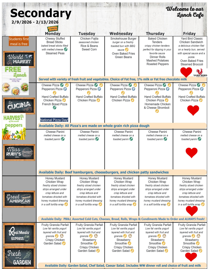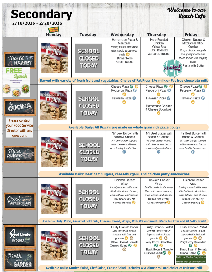 Feb. 20: Classic Cheese Pizza, Steamed Broccoli, Fresh Banana Feb. 23: Homemade Mac & Cheese, Dinner Rolls, Steamed Peas, PB&J Sandwich, Celery, Applesauce