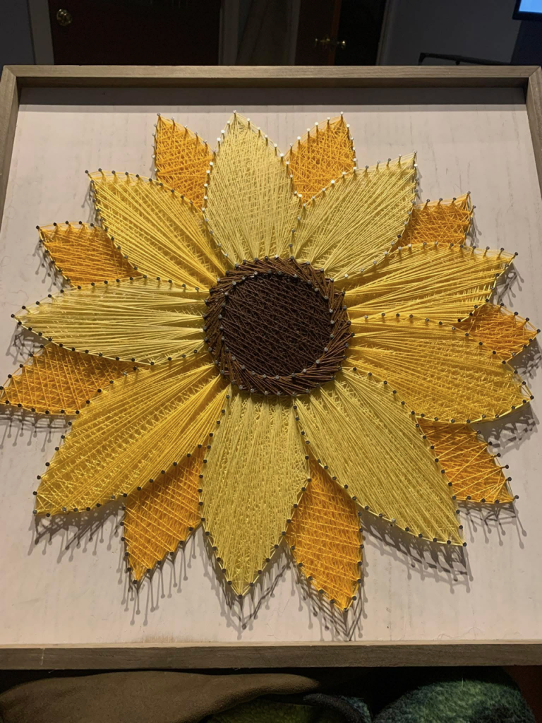 This week’s featured project is string art, offering participants a creative opportunity to design and build their own unique piece. (Example shown below.)