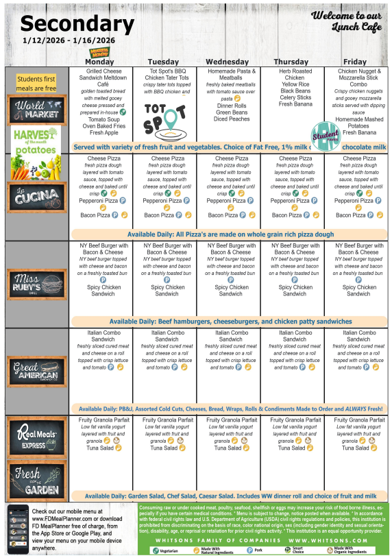 Menus for the elementary and secondary schools are listed below and are also available online.